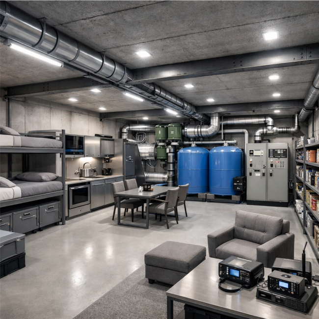 Projelerimizde, NBC (Nükleer, Biyolojik, Kimyasal) filtreleme sistemleri, basınç dengeleyici havalandırma, oksijen desteği, jeneratör ve güneş enerjisi entegrasyonu, hijyenik tuvalet çözümleri, tıbbi malzeme depolama ve güvenli iletişim altyapısı gibi hayati sistemleri standart olarak değerlendirir ve ihtiyaca göre entegre ederiz.